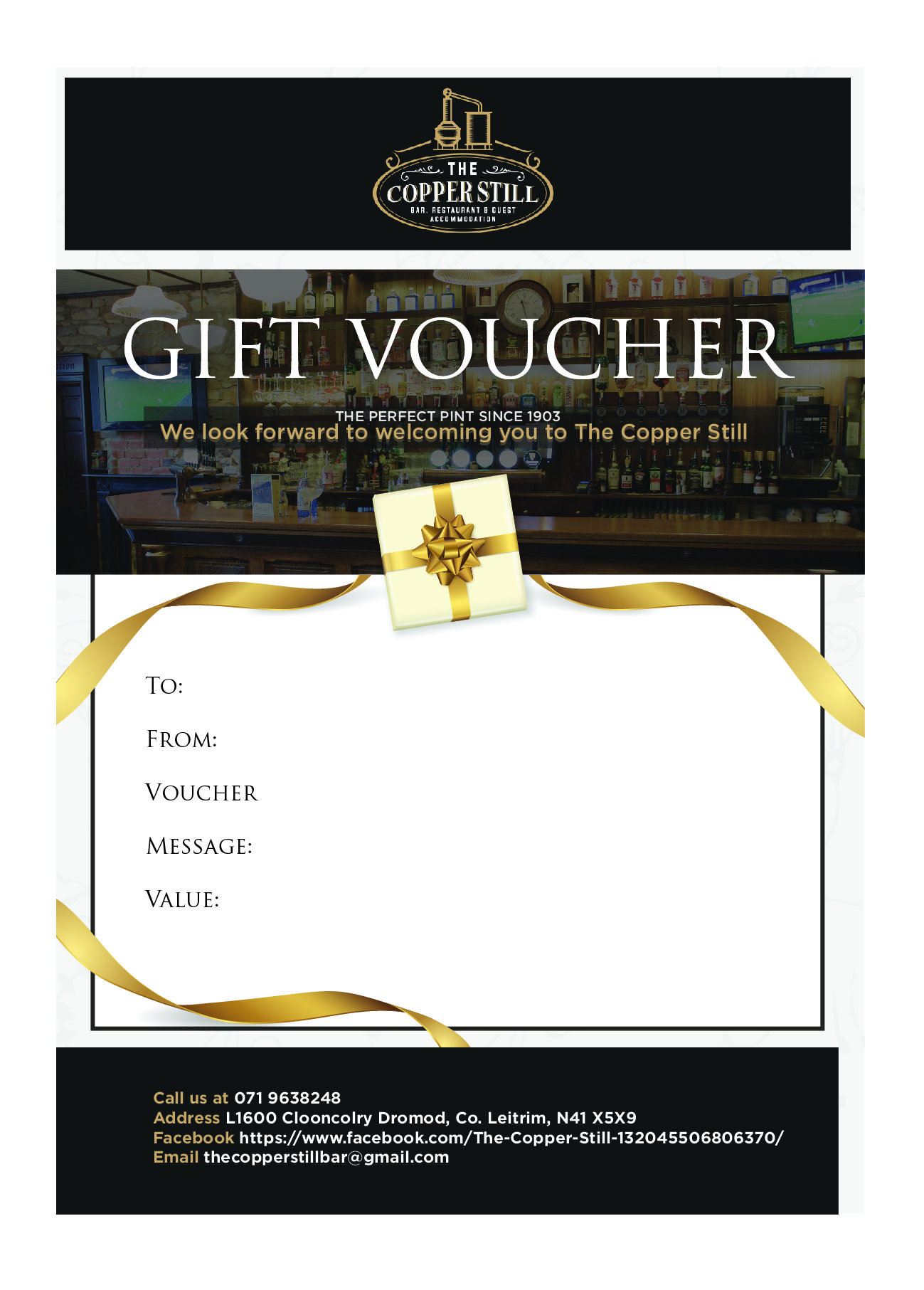 Treat your family or friends to a monetary voucher which can be used towards dinner, drinks, or a stay in The Copper Still.